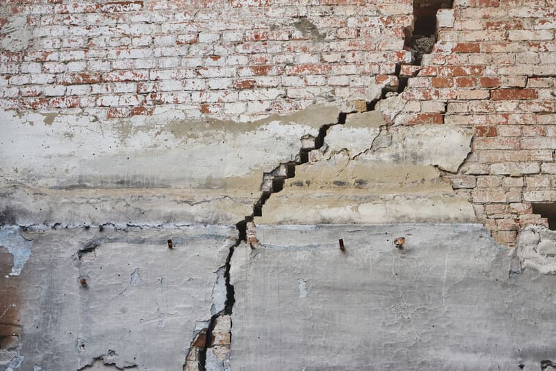 Признаки тяжёлых структурных повреждений треснувшей кирпичной кладки дома: